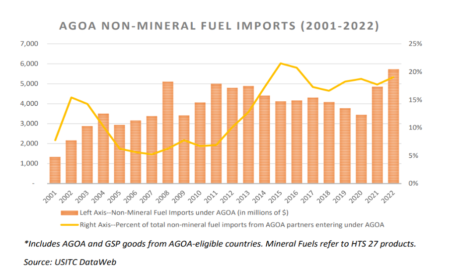 Petroleum products continued to dominate AGOA imports, constituting 45 percent of the overall imports. However, non-oil imports under AGOA reached a record high of $5.7 billion in 2022, quadrupling the amount recorded in 2001. Notably, several non-oil sectors experienced substantial growth during this period, including apparel, auto parts, macadamia nuts, jewelry, fresh oranges, and footwear.