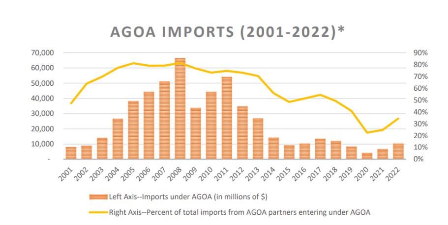 In 2022, imports under the African Growth and Opportunity Act (AGOA), including the Generalized System of Preferences (GSP), totaled $10.3 billion, marking a significant 26 percent increase compared to 2001, the first full year of AGOA trade. This figure remains consistent with the average of $11.6 billion witnessed over the last decade.